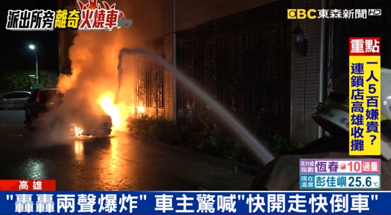 停在路邊的車子,在半夜裡突然起火,還發出兩聲爆炸聲,消防隊還沒趕來之前,附近的民眾看到這景象,嚇壞了。這輛起火的