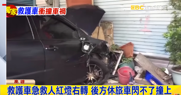 高雄發生一起救護車與休旅車的碰撞車禍,一輛救護車疑似趕著載病患紅燈右轉,結果害後方休旅車閃避不及,直接撞上,休旅車還撞進民宅,差點就波及旁邊的店家。
