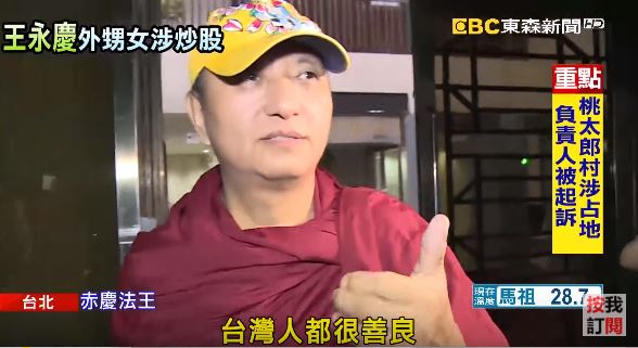 赤慶法王:「台灣人都很善良。」緩緩走出地檢署面對記者提問,赤慶法王只露出微笑並伸出左手比了大拇指 ,稱讚台灣人都很善良,這位自稱法王的赤慶,涉嫌與已故台塑集團創辦人王永慶的外甥女謝佳真還有