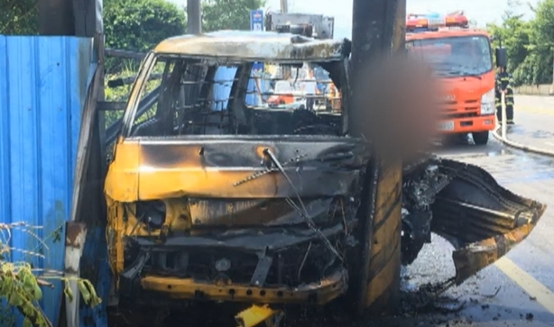 駕駛逃生不及慘遭烈火吞噬,火勢撲滅後,消防員在現場拉起封鎖線,整台公務車的車體變形、燒得面目全非,根據了解44年次的楊姓駕駛是中華電信資深員工,到桃園市觀音區進行機台維護,但是行經中山路二段時,不明原因自撞造成車輛起火。