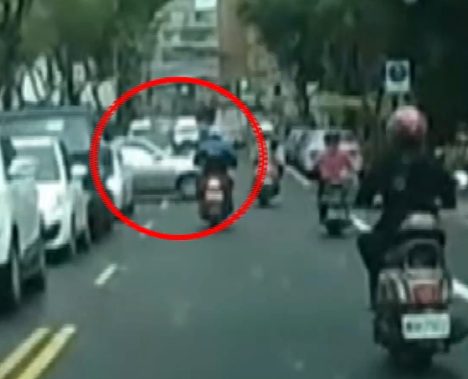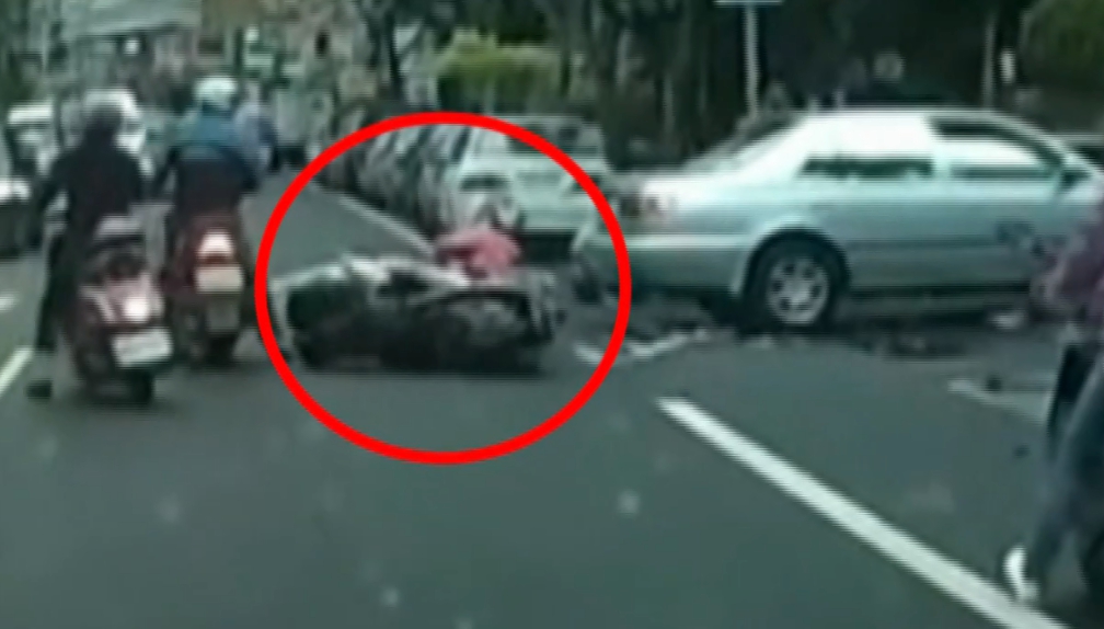 行車紀錄器拍下,號誌一轉成綠燈後,機車跟轎車便催油門往前行駛,但就在下一個路口,畫面左邊突然有台轎車從巷子竄出來,與摩托車對撞,後方另一名騎士也反應不及撞上,煞車時重心不穩,不慎摔倒,被這驚險的一幕嚇到,後方駕駛跟一旁的騎士,紛紛放慢速度,上前關心騎士的傷勢。