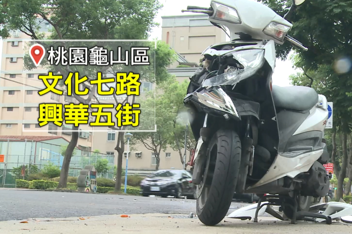回到事發現場,被撞的機車還放在路旁,車頭幾乎全毀,後照鏡撞斷嚴重變形,零件散落一地,還好騎士只有輕微擦傷,這起車禍就發生在桃園龜山區文化七路跟興華五街口,當時轎車駕駛沒有注意右方是否有來車,直接加速行經路口,而騎士當時也沒有放慢車速,所以才會釀成意外。
