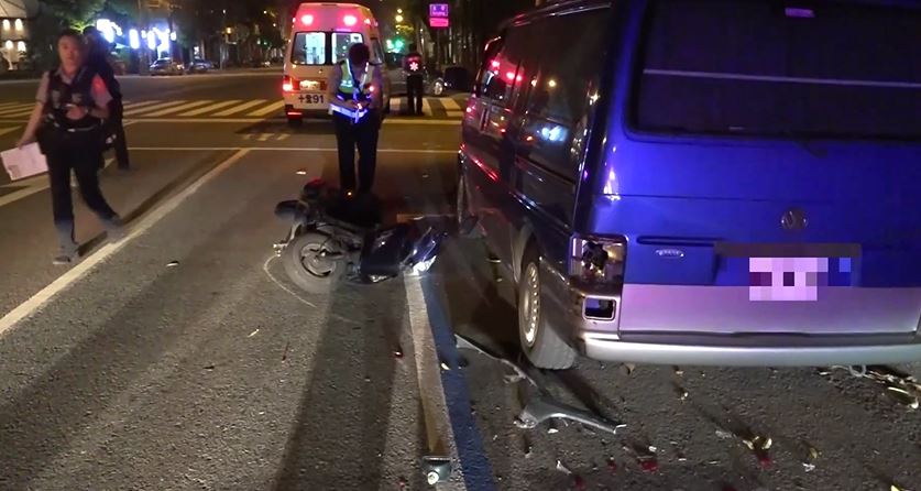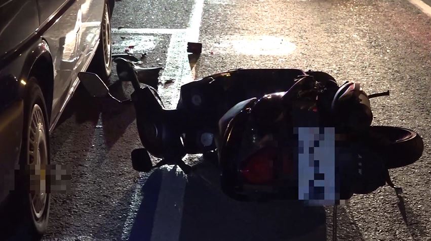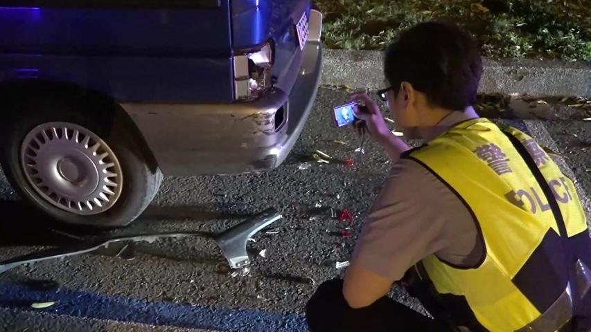 男子意識清醒,倒臥在地拿著手機,準備和家人報平安。而另一頭男子的機車車頭全毀,就這麼倒在廂型車旁,這輛被撞的廂型車,車尾燈被撞掉碎片四散,廂型車車主到場查看超無奈,沒想到好好停在路邊也遭殃,警方則忙著在一旁蒐證,釐清肇事原因。
