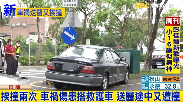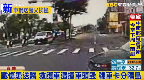 救護車鳴笛,趕著將傷患送往醫院,但就在行經一個路口時,突然有台轎車竄出來,救護車煞車不及撞上後,整台車偏向對向車道,嚇得三名騎士趕緊移開摩托車。這起車禍造成救護車車頭全毀,零件散落一地,連車牌都被撞到掉在路上,與救護車擦撞的轎車,在強烈撞擊下撞上