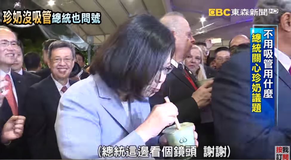 偷偷吸口珍奶,蔡總統很享受,去年國慶酒會上,帶著吐瓦魯總理,介紹台灣小吃,珍奶議題也在民進黨中常會上被討論,余天先問,「珍珠奶茶的事件現在是怎樣,講這種話社會有辦法接受嗎」,總統蔡英文則回應,「我也想問環保署,珍珠奶茶不用吸管,是要用什麼,湯匙不也可能是塑膠的嘛。」