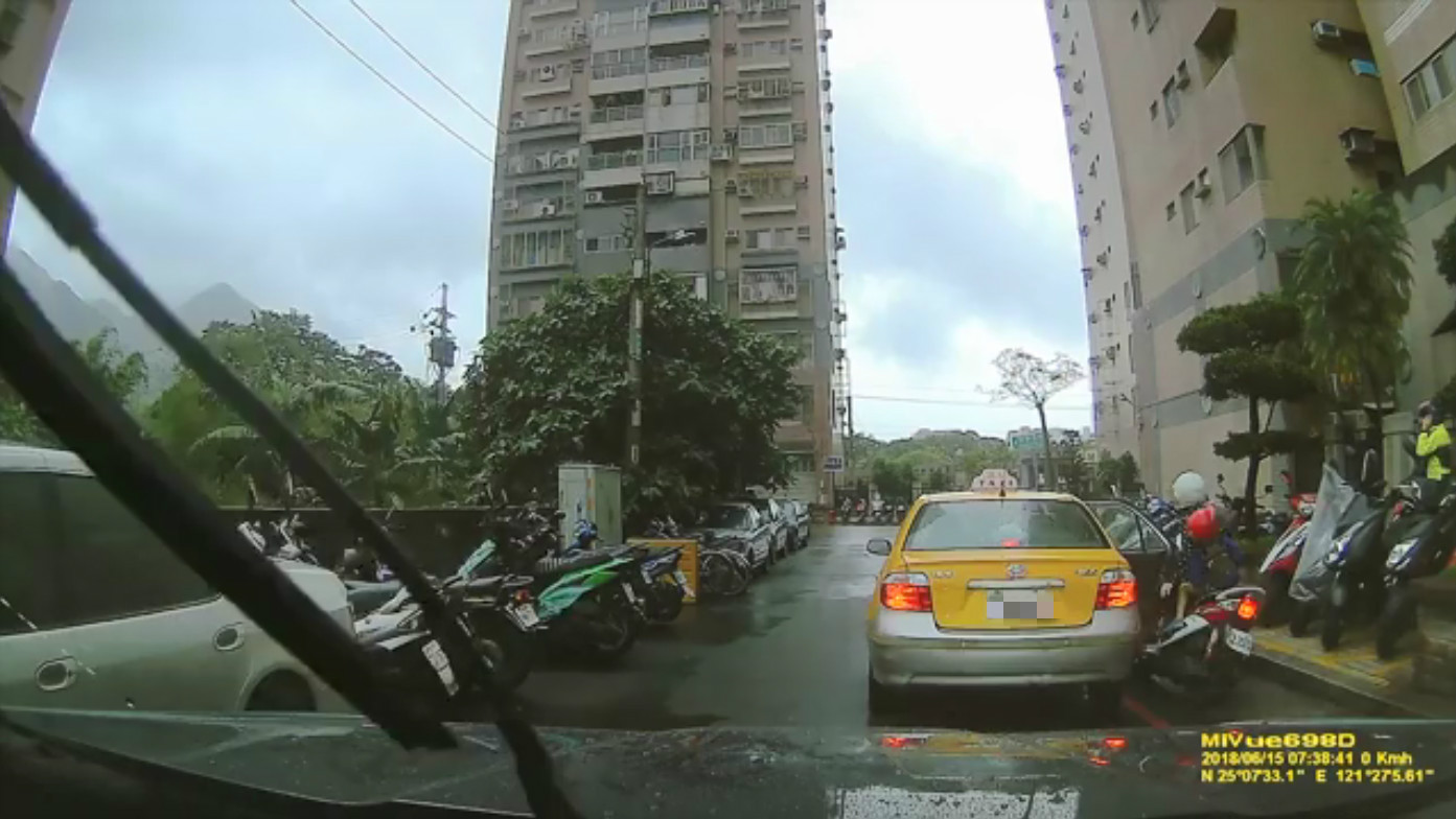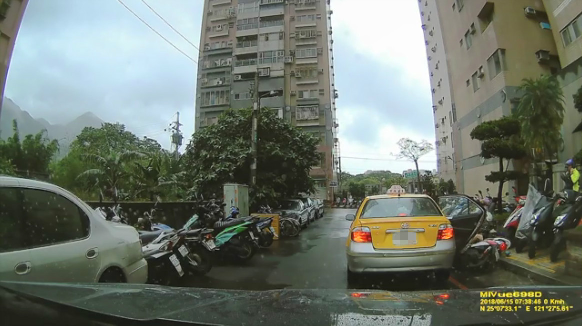 行車紀錄器畫面可見,他開車行經八里頂寮五街時,前方有輛計程車在紅線臨時停車,不料一輛摩托車經過,乘客剛好打