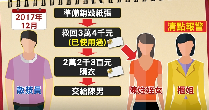 還原事發經過,去(2017)年12月中,擔任散漿員的陳姓男子原本開著鏟車,準備進行紙張銷毀作業,但他眼尖發現有一疊禮券,立刻下車搶救價值一共3萬4千元的禮券,因為沒看到禮券有標示使用過的註記,男子把禮券占為己有,請陳姓姪女幫忙代購衣服。
