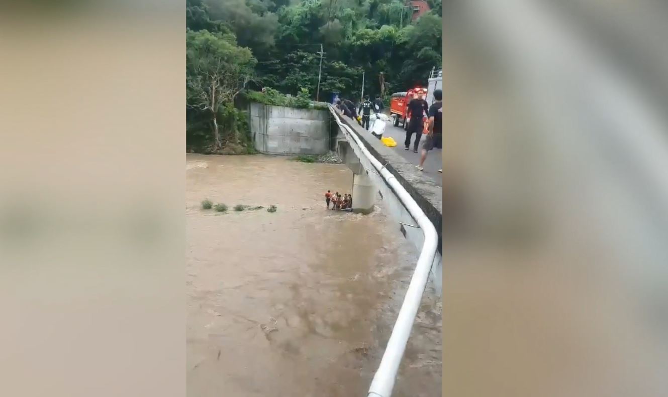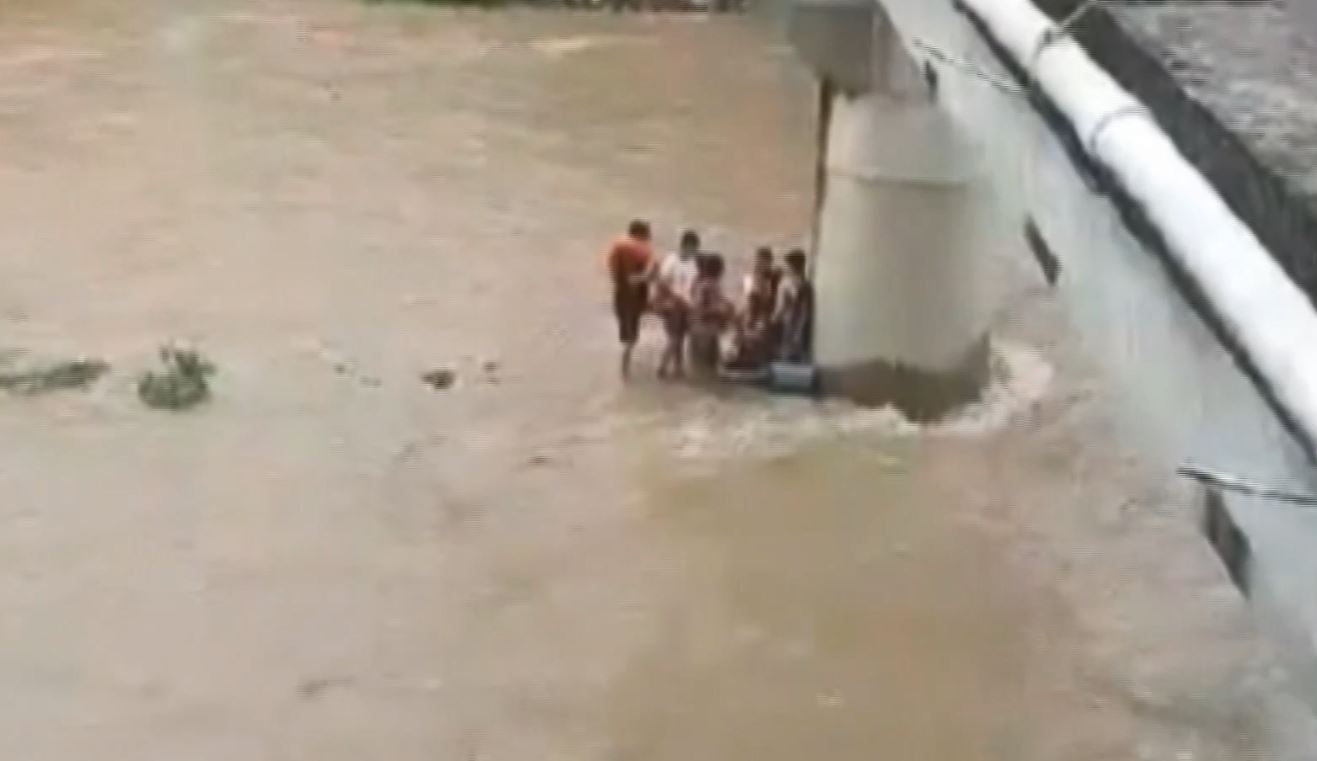 一群被困在橋墩下小沙洲的人牽著彼此,就怕水再滿上來。新北三峽山區,受到午後熱對流影響,午後下起豪雨,造成大豹溪溪水暴漲,有民眾烤肉烤到一半受困,消防局接獲通報,趕緊派人來救援。經過了解,受困民眾本來在橋下沙洲烤肉,沒想到山區下起大雨,造成大豹溪溪水暴漲,民眾來不及跑,受困在離岸邊大約20公尺的沙洲上。消防人員到場後,確認暫時沒有立即性的危險,先丟救生衣與魚雷浮標給受困民眾,並在金龍橋下游架設攔截繩,防止民眾遭溪水沖走,接著從橋上架設吊索,先將小孩吊掛上來,接著陸續把受困的6名大人救上岸。