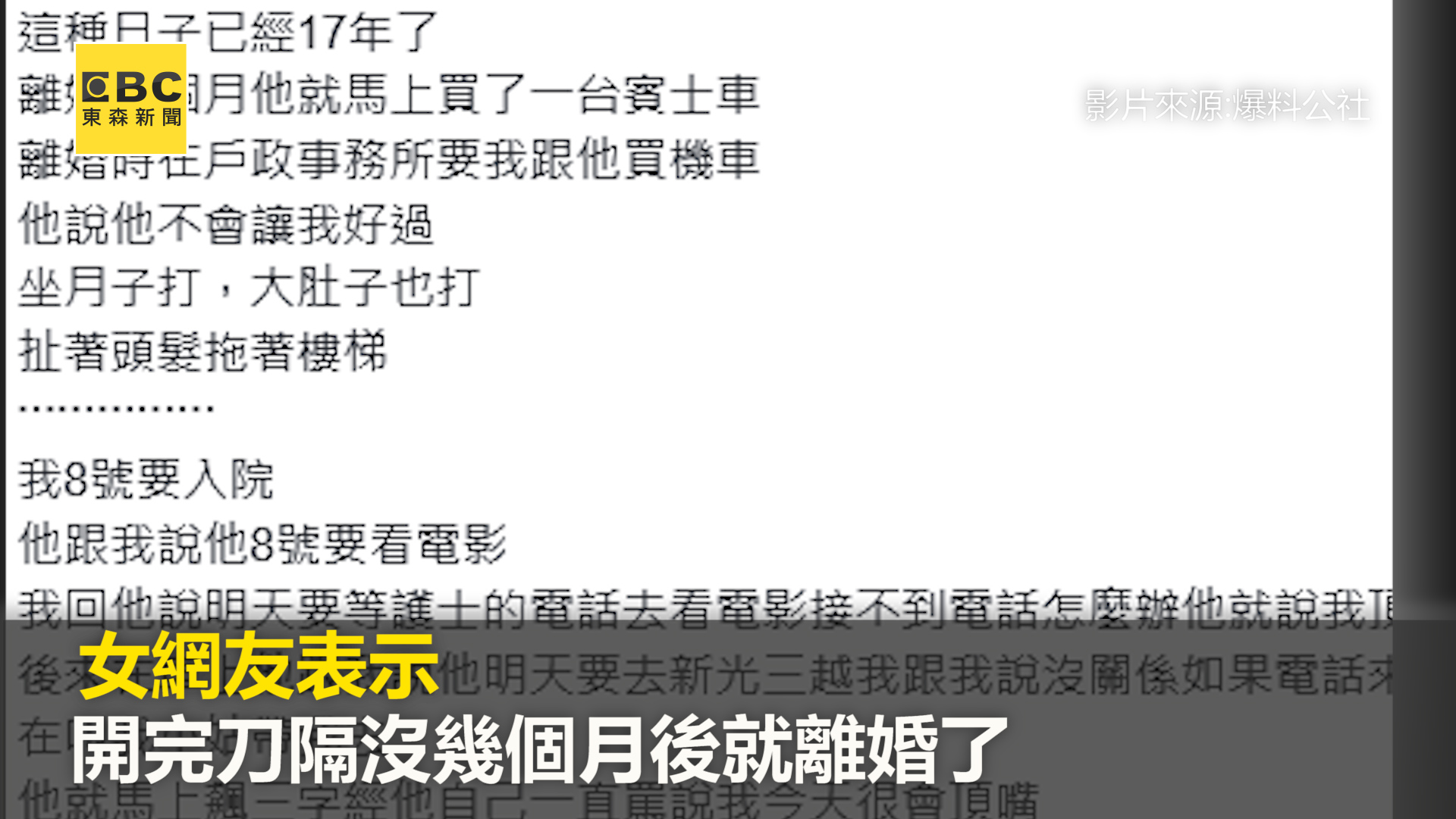 離婚了,在離婚前,他給我兩個選擇,一是離婚,二是他個性不會改變,而且會讓我生活更難過,這樣一跟二選擇不都一樣嗎?最後反而到處跟別人說是我和他離婚的,這種日子已過17年了,連坐月子時也被打」。