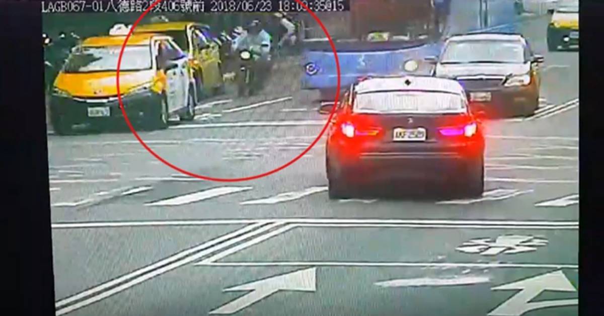 計程車突然加速往前猛衝,車縫中的騎士嚇到直按喇叭、往旁邊閃躲,但小黃繼續加速,從外側超車惡意逼車,還任意變換車道,一個甩尾撞倒機車。騎士和後座乘客摔倒在地、無法站起,差點被後方公車碾過去,畫面驚險萬分。