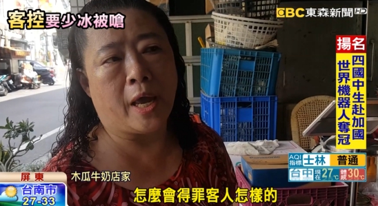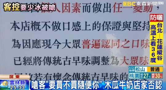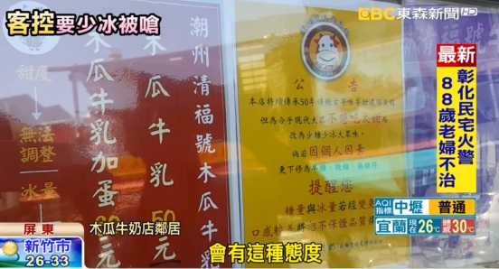 記者實地走訪這家木瓜牛奶店,店家在門口貼出告示,萬一更改冰塊和糖分等,會造成口味不對,店家說雖然希望顧客不要更改,但是絕不會用要買就買,不買拉倒的口氣。木瓜牛奶店家:「不可能,生意人賣一杯是一杯好,怎麼會得罪客人怎樣的,對不對?五十塊都是賺的。」