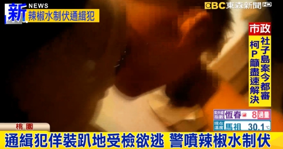 員警荷槍實彈,一邊喊話一邊小心轉開門鎖,房門打開迅速攻堅。看見員警破門,身穿灰色衣服的廖姓犯嫌,正打開窗戶想要逃走,員警一個箭步上前將人拉下,喝令他趴在地板,但廖姓犯嫌還想逃,假裝配合趴下卻快步往房門衝意圖要逃,被門口員警噴灑
