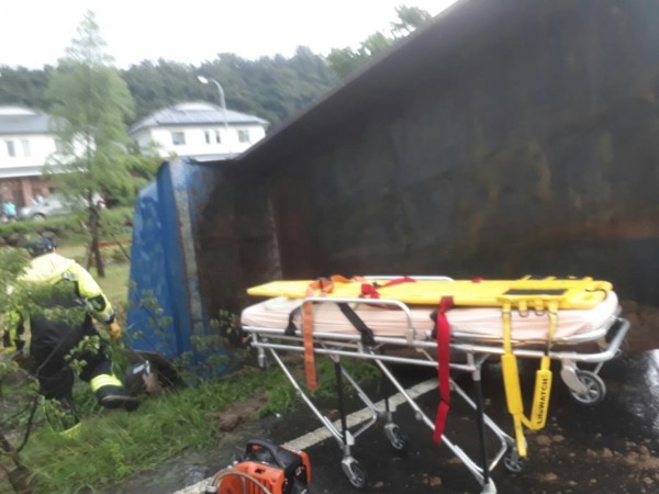 的林姓駕駛被拋出車外,遭到另一部15噸拼裝車重壓,目前生命跡象微弱,送醫搶救中。