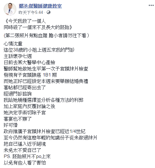 鄭丞傑26日在臉書發文感嘆,「今天我救了一個人,同時殺了一個來不及長大的胚胎」表示一名懷孕7週的38歲女子因為要產檢,而做了第一次