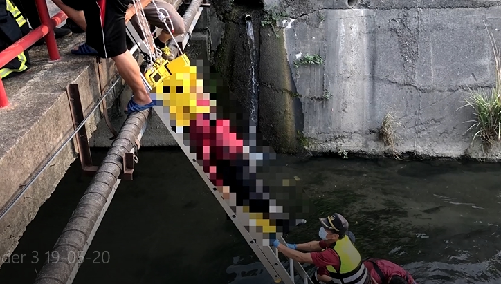 救護人員到場架梯下到河床,把傷患拉抬上岸,但人已經沒有呼吸心跳。前(28)日在苗栗公館鄉竹安橋附近發生