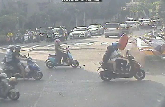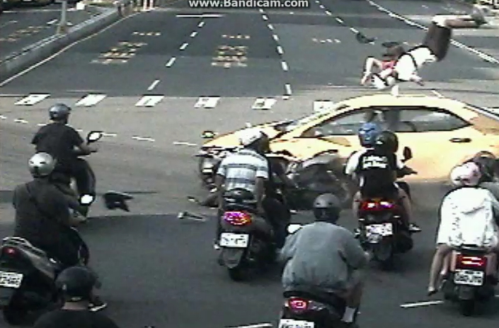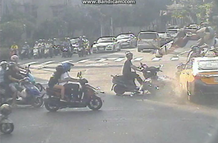 搶黃燈,連續撞了3輛機車,造成5名包含機車騎士及後座乘客受傷,其中2男1女傷勢較重由救護車送醫。