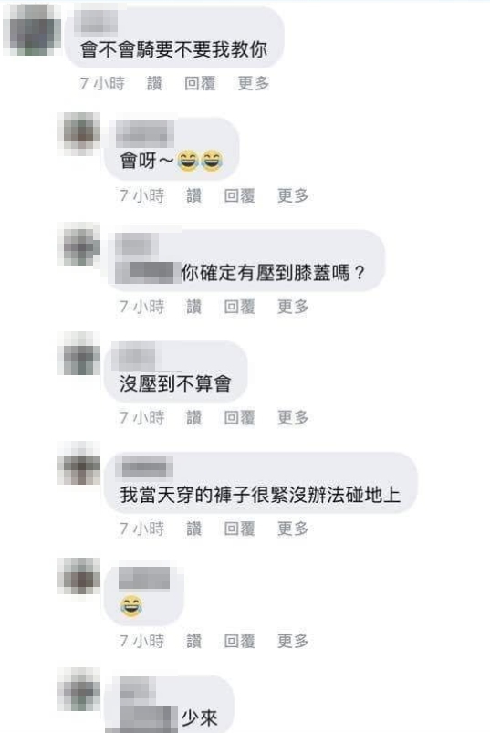 另一篇則是朋友問少年「會不會騎,要不要我教你」,少年自信的回應「會呀」,朋友追問「你確定有壓到膝蓋嗎」、「沒壓到不算會」,少年又貼出哭笑不得的表情符號,表示「我當天穿的褲子很緊,沒辦法碰到地上」。