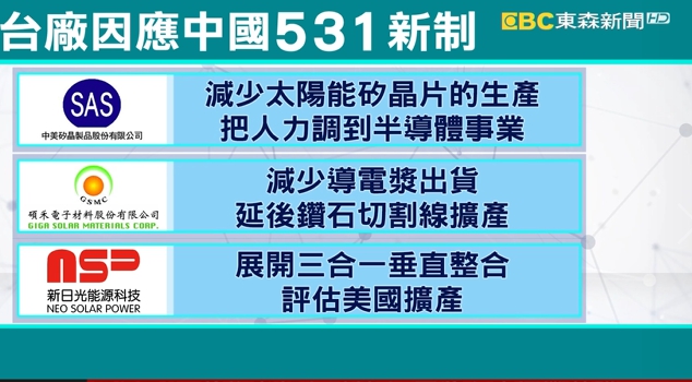 面對中國大陸嚴苛新制,台廠也紛紛出招,中美晶就減少太陽能矽晶片的生產,並且把人力調到半導體事業,碩禾同樣減少導電漿出貨延後擴產時程,新日光則是展開垂直整合,並重新評估美國擴產可能,就希望能度過