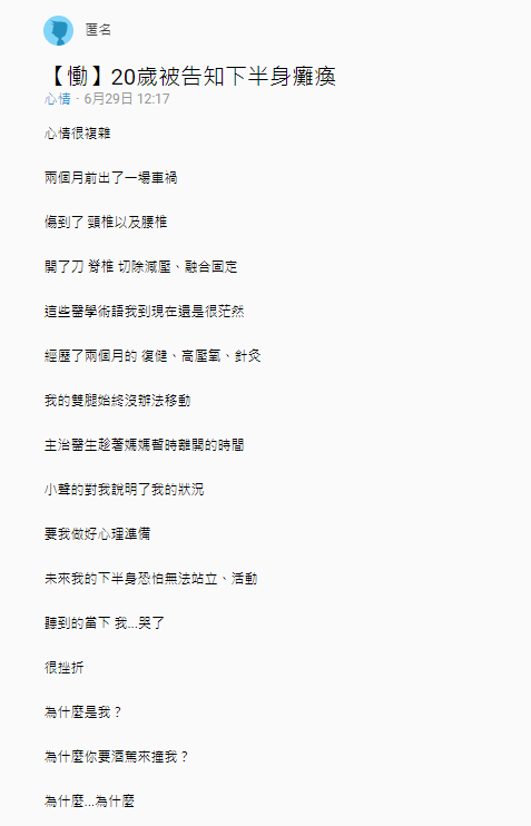 原PO在Dcard上表示,車禍後常聽到醫師口中說的「切除減壓」、「融合固定」一些醫學術語,即使到現在還是一知半解又茫然,不過,某次主治醫生趁著媽媽暫時離開的時間,小聲地對他說明了自己目前的狀況,並要他做好心理準備,未來他的下半身恐怕無法站立、自由活動,聽到這番猶如晴天霹靂的消息,讓他當場難以接受地流下了男兒淚,內心不斷上演天人交戰的痛苦煎熬,不知道該如何向媽媽說出口:「你的兒子下半身癱瘓了」