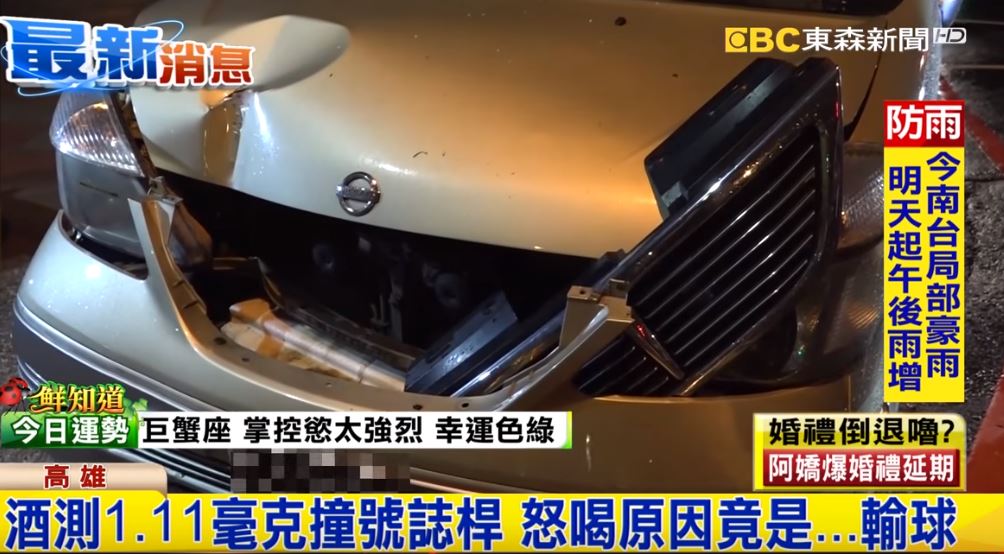 高雄市4號凌晨發生一起自撞車禍,一輛廂型車不明原因直接衝上人行道,撞斷號誌燈桿才停下。肇事駕駛自行脫困,但整個人卻僵硬的像個木頭人,員警對他進行酒測,酒測值高達1.11毫克,被問到怎麼會喝這麼多酒,他說因為支持球隊輸球才會怒喝。