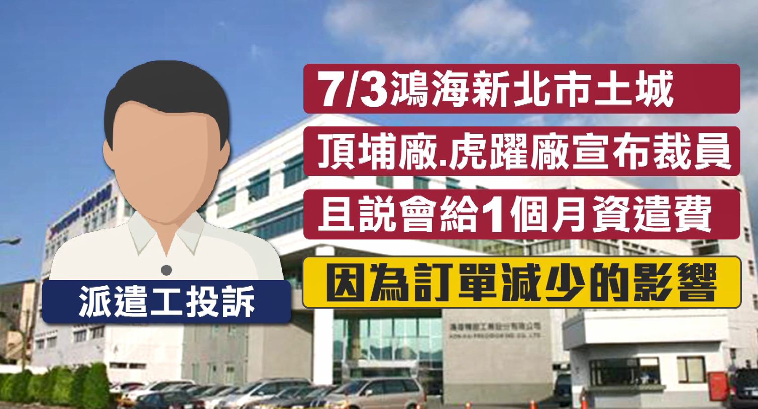 裁員,並說會給一個月的資遣費。鴻海今(5)日早上證實有此事,確實有少數的派遣人員不續約,但也強調並沒有要裁減正式員工,並澄清會這麼做只是因為跟派遣公司的契約已到期。