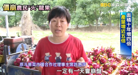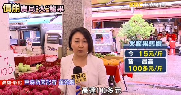東森新聞記董懿嫺:「在水果賣場裡,七顆火龍果只要100元,每斤價格15元再創新低,實際上在3年前火龍果一斤高達100多元,當時農糧署就已經提出警告。」