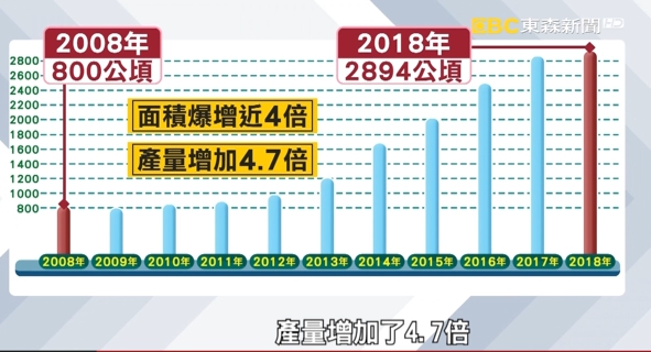 從10年前的800公頃,到去年種植面積達到2846公頃,今年的6月為止耕種面積已經達到2894公頃比去年增加4%,產量跟去年相比增加8%,10年來台灣紅龍果的種植面積暴增4倍,產量增加了4.7倍。