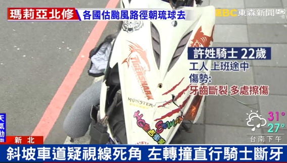 許姓騎士多處擦傷,連牙齒都撞斷了,由於車道在一處斜坡,視線死角車速,都可能是車禍原因。