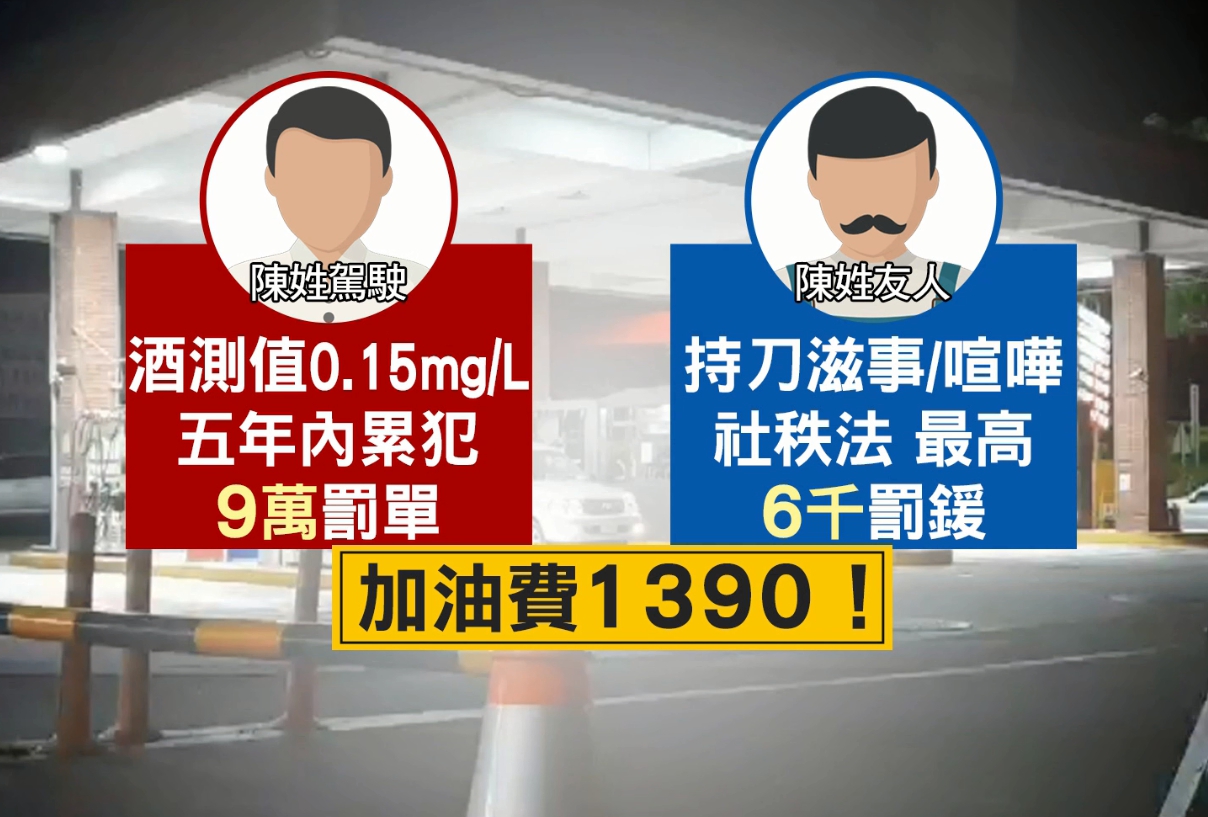 酒駕再犯被依法開單,友人見陳姓駕駛就酒駕送辦,認為店員不上道,1個多小時後,竟然持刀回到加油站要找店員理論,警方2度趕回現場,將這名陳姓友人帶回偵辦,加油站低調表示不清楚狀況,算一算這場霸王油戲碼代價可不低,酒駕的陳姓駕駛酒測值0.15,開出9萬罰單,持刀大鬧加油站,陳姓友人則是依社秩法處以最高6千罰鍰,但2人明明付不出油資不過1390。