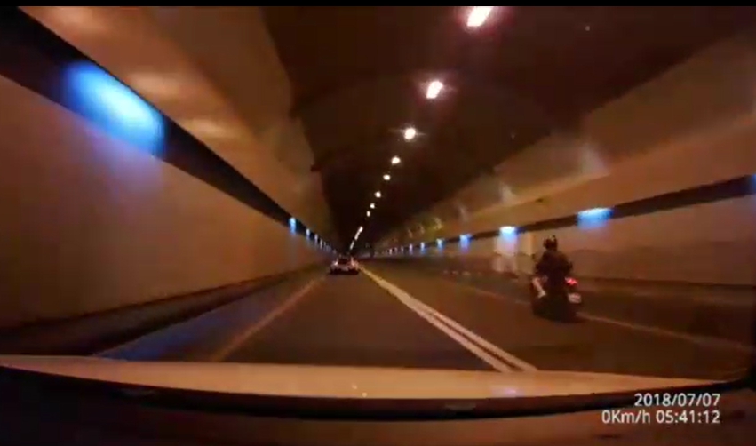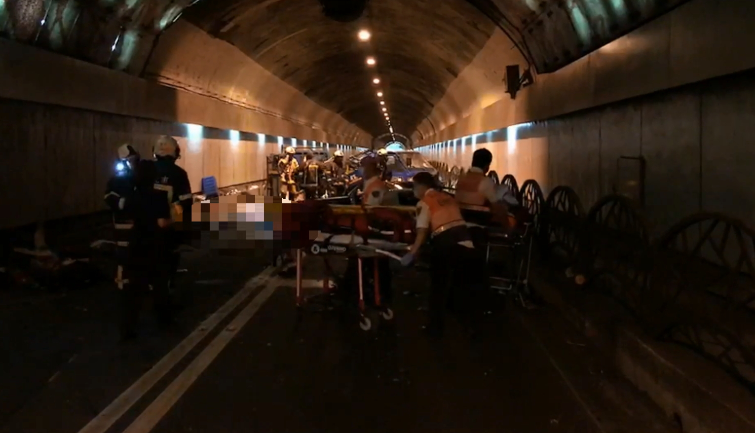 台北市消防局清晨5時許獲報,自強隧道內士林區往中山區方向發生車禍,隨即派多輛救護車輛及人員前往現場,發現隧道內一輛白色藍寶堅尼跑車從後方追撞在現場施工的2輛工程車。