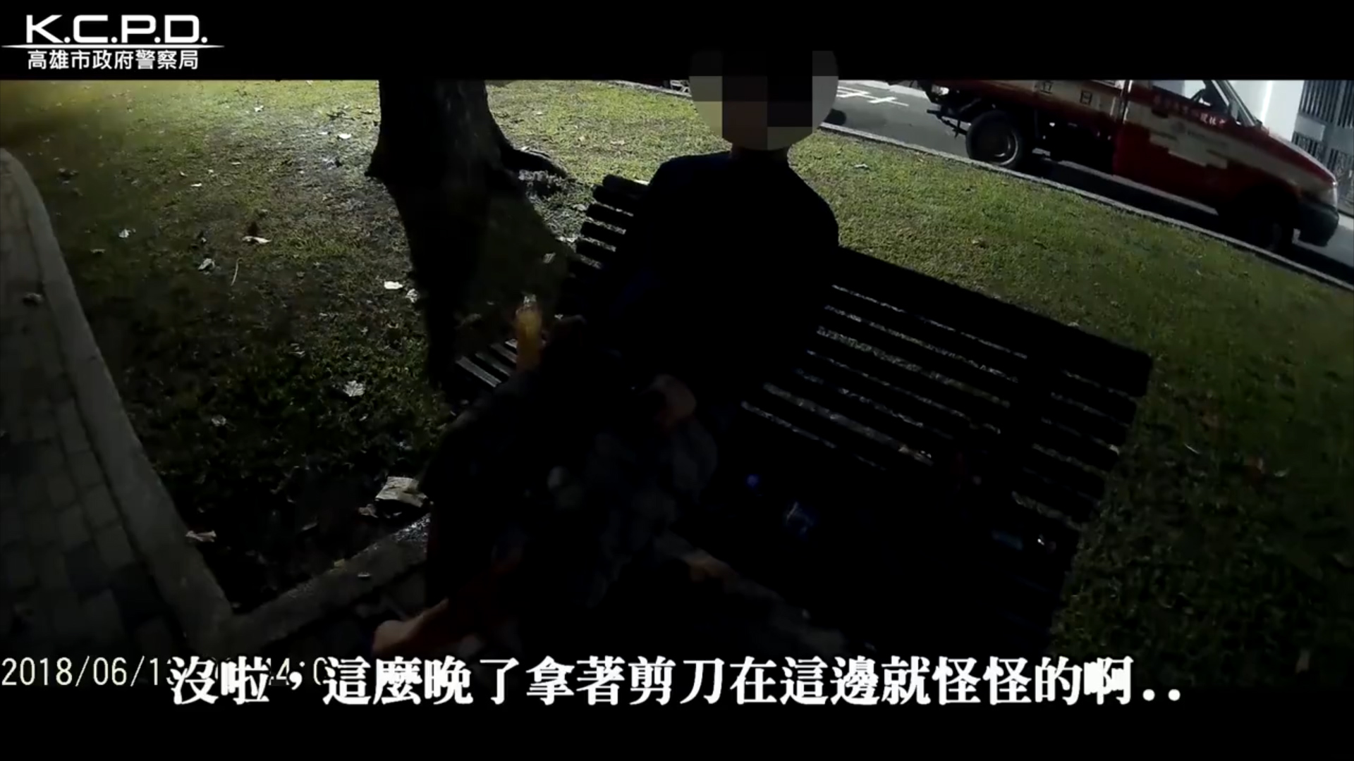 愛河岸邊,覺得有異遂前往了解,發現一名男子拿著剪刀呆坐在一旁木椅,似有