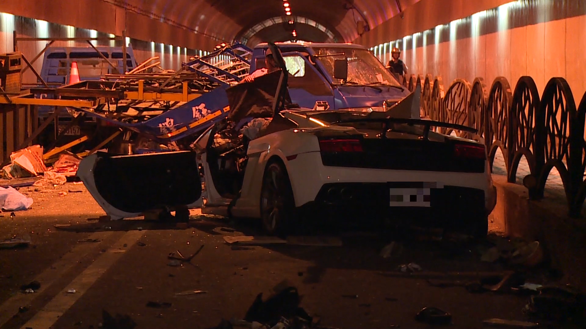 台北自強隧道凌晨發生死亡車禍,游姓駕駛開超跑要跟朋友出去玩,進入隧道後,車速加快,閃過旁邊車輛後,赫然看到2部工程車停在路中間,工人正在更換燈泡,閃避不及,車子失控先撞上路邊護欄,再回撞工程車,造成1名張姓工人不幸慘死,超跑副駕駛座上的女性友人傷重不治,游姓駕駛跟另外2名工人,受到輕傷。
