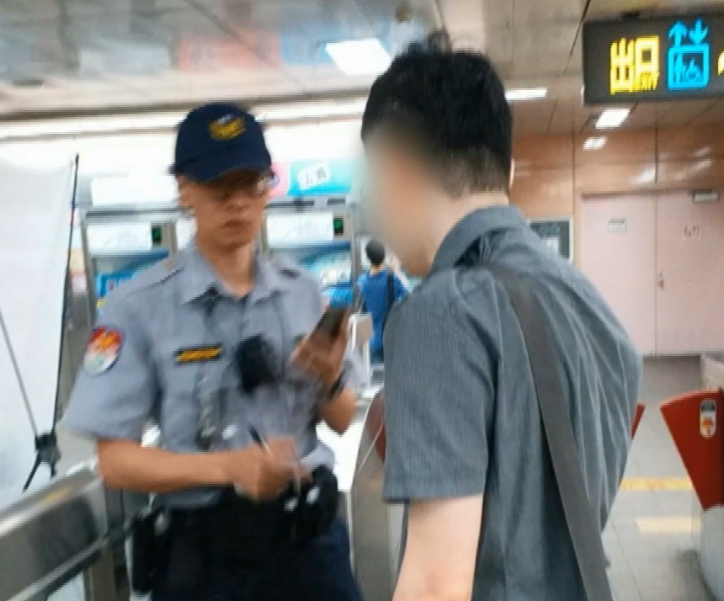 捷運站月台出口處,一名灰色襯衫男子被捷運警察攔下調查,因為有人指控他在車廂內,藏一個