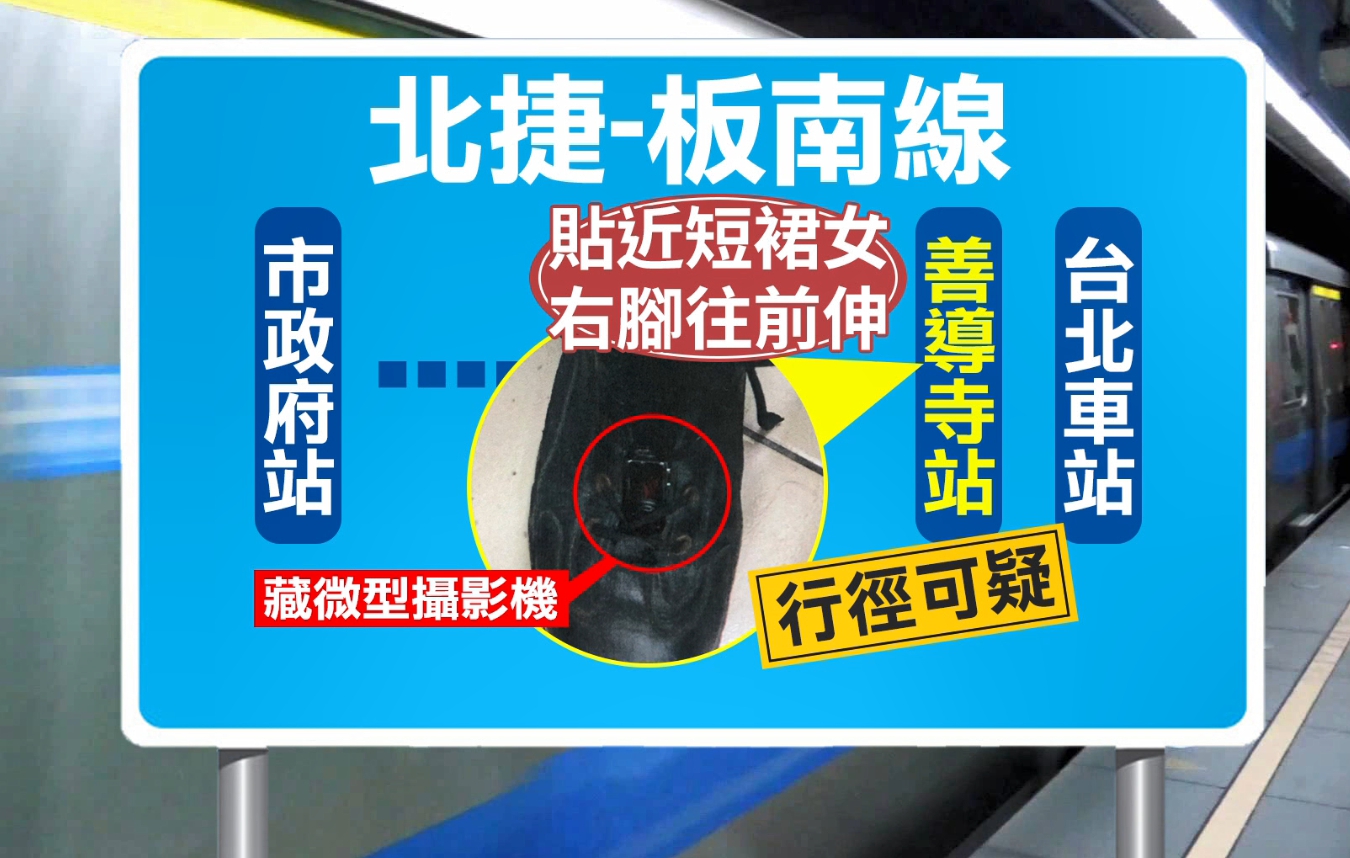 上個月11號下午1點50分,北捷又出現偷拍色狼,市政府捷運站不論平日還是假日人潮都很多,這名男子竟大膽裝上微型攝影機後,在市政府站上車隨機找短裙女子下手,就在善導寺站他突然靠近短裙女子,還不自然地伸出右腳,在女子雙腳中間,怪異行徑被發現,而且仔細看他的右腳,竟藏有微型攝影機。
