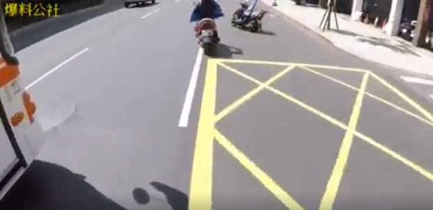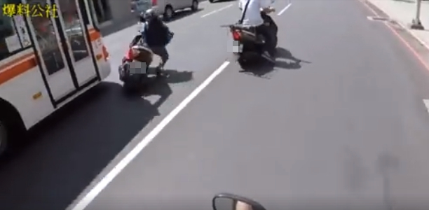 《爆廢公社》,只見行經一處沒有紅綠燈的路口時,一位男子從右邊路口快速衝出,隨即右轉,前方的女騎士差點撞上,趕緊將車往左邊偏移,沒想到男騎士似乎根本沒有在看車,繼續往她靠過去,接著兩台機車擦撞,男子雙腳一蹬穩住車身,不過女騎士卻被撞飛倒地。