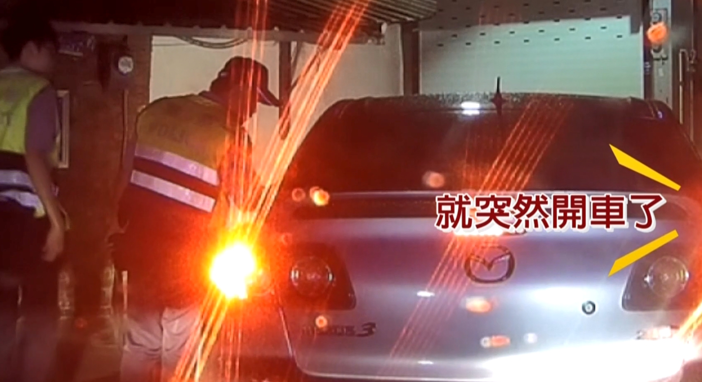 颱風夜苗栗市警方執行勘災勤務,前方發現一部自小客車沒開燈,警方跟著上前關心。
