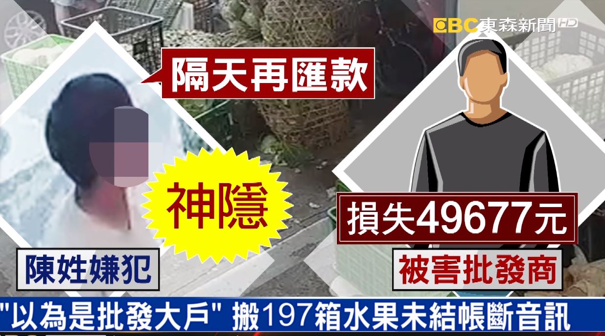 但從11號至今陳姓女子宛如人間蒸發,錢沒有匯,打電話也沒有消息,通訊軟體甚至直接封鎖,而被載走的水果加起來,店家共損失了近5萬元。