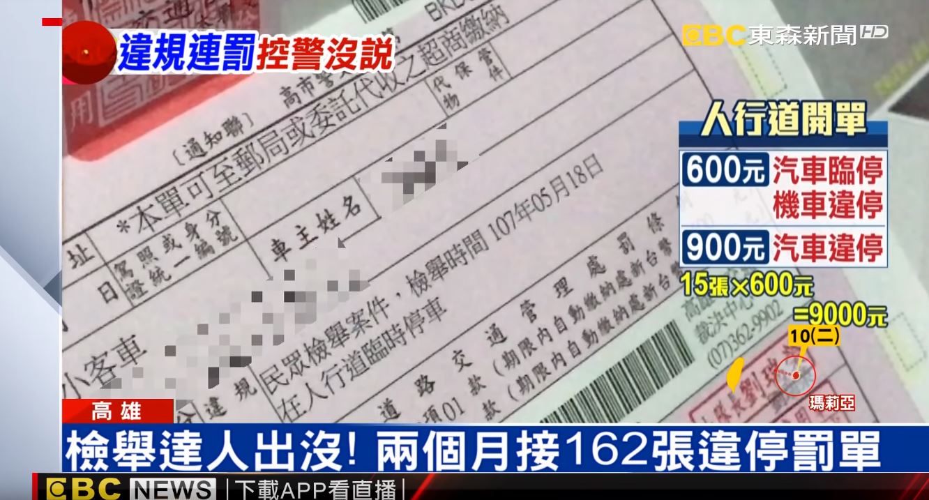 住戶為了方便,常把汽機車停在自家前方的人行道上,13年來,本以為鄰居都有共識,誰知道近來竟出現檢舉達人,10戶住家共接到162張罰單。違停住戶:「這是人行道,可是這是郊區,我們13年從來沒有(被告知不要停)過,如果跟我們告知,開一張,我們就知道了。」同一戶人家兩個多月內就接到10幾張罰單,若以罰金600元來說,15張就要近萬元,但是今年5月開始,高雄市警局有公布,同一地點若被開單超過3次,警方應該要告知,但是居民說,罰單一直來,卻沒有接獲警方通知。高雄小港分局交通組長曾贊憲:「一個禮拜,同台車違規停放2次以上,我們警方智慧型登錄系統就會顯示紅色,這時我們就會派員去告知。」