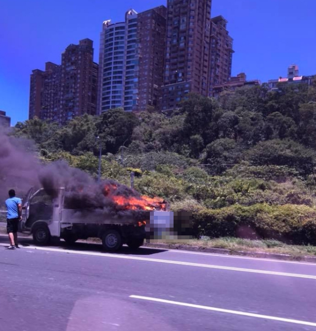 機的小貨車,14日在行駛過程中突然起火燃燒,駕駛發現後,連忙將車子停在路旁,但整台車已經陷入火海,警消急到場搶救,所幸火勢順利撲滅,