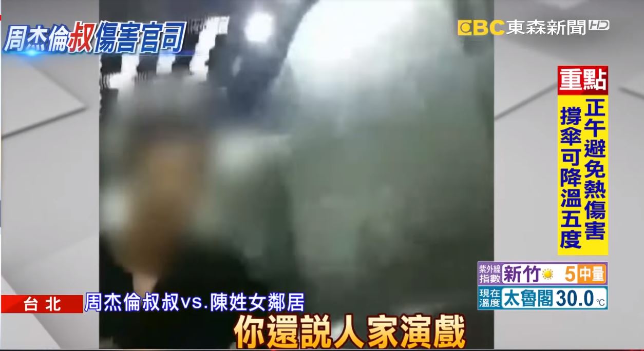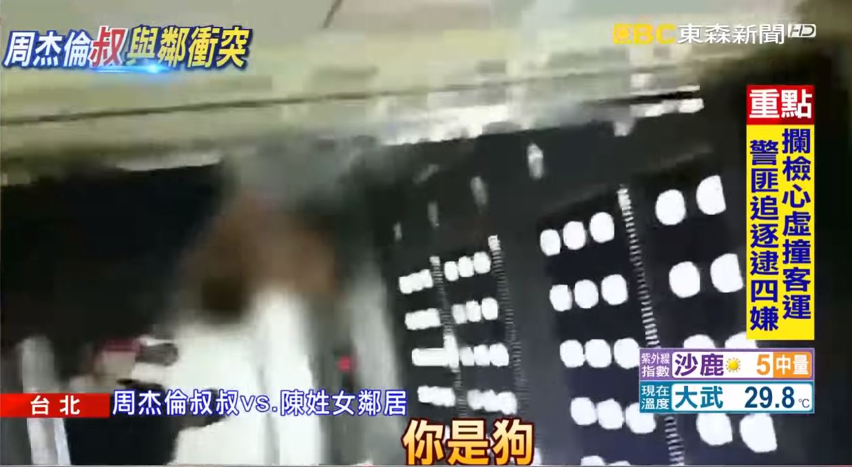 黑衣男子和陳姓女鄰居在住家電梯前大吵,他是周杰倫的親叔叔,遭女鄰居指控在電梯毆打她,而周杰倫叔叔也嗆回去。