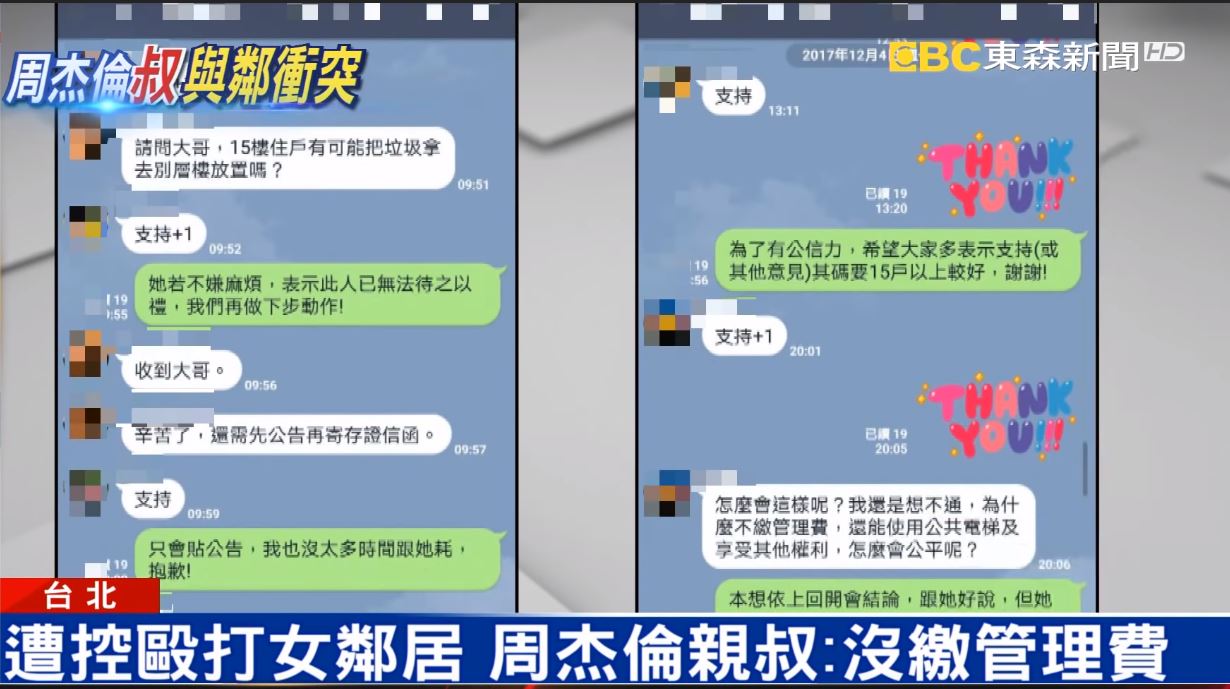 陳姓女鄰居在去年4月,在台北市民生社區買房,5月開始裝潢,12月入住,而她正好和周先生是鄰居,當時因為周先生是主委,多次找她催討前屋主積欠的10萬管理費,以及之後每月2500元的管理費用,但女鄰居自認已花了45萬修頂樓漏水,多次嫌隙引爆衝突,周先生出示大廈管理員LINE群組,上面大家都在討論,陳姓女鄰居積欠理費費的問題,不少人認為要使用公共空間,就要公平繳費,兩人各說各話,現在雙方鬧上法院,誰是誰非還得由法官定奪。