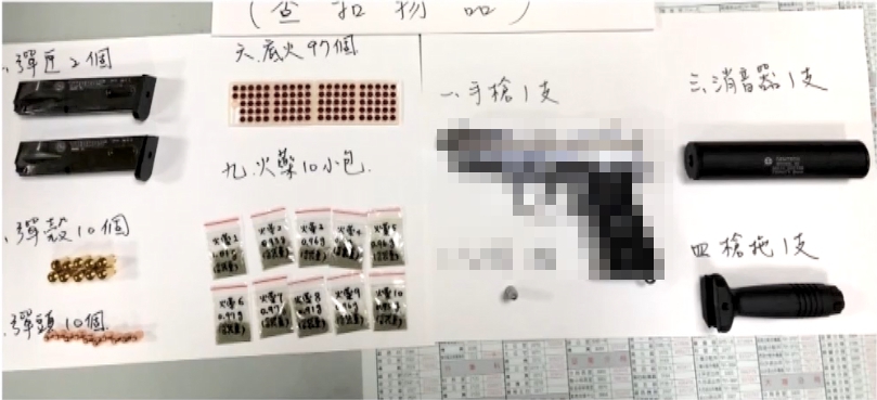 ▼警方攻堅時查獲改造的槍枝和一支變音器,還有子彈成品、半成品等物品(圖/東森新聞)
