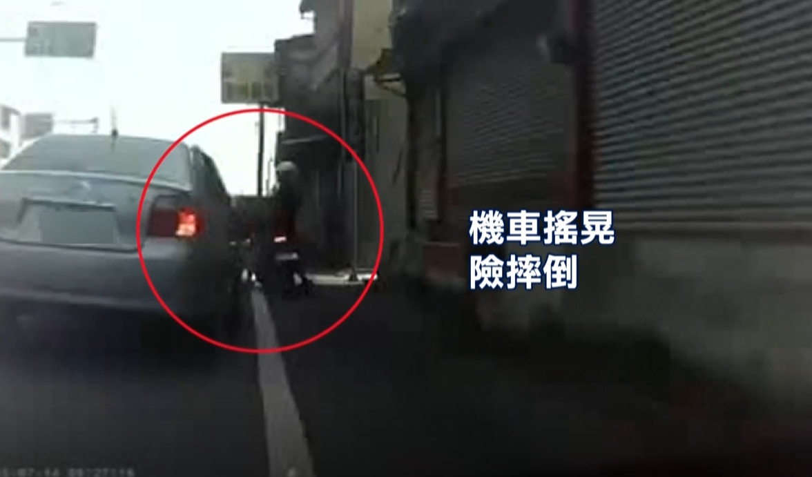 轎車的危險逼車,從行車紀錄器可見,騎士好端端的騎在道路上,但轎車卻刻意往騎士靠近,不斷往右偏移,騎士被嚇到,導致機車左右搖晃,好在他穩住龍頭,才沒有釀成傷害。不過,轎車確實有擦撞到騎士。