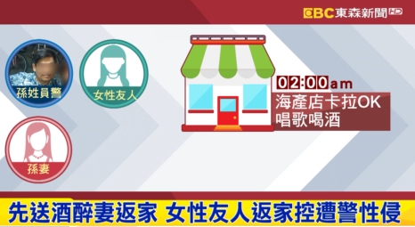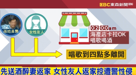 喝酒唱歌,凌晨4點多他開車載女性友人回家,而這名女子在家門口大吼大叫說自己被警察性侵,雖然孫姓員警否認,但檢查他的衣褲和車內跡證有性行為痕跡,將他依照妨害性自主送辦,並且調職處分。