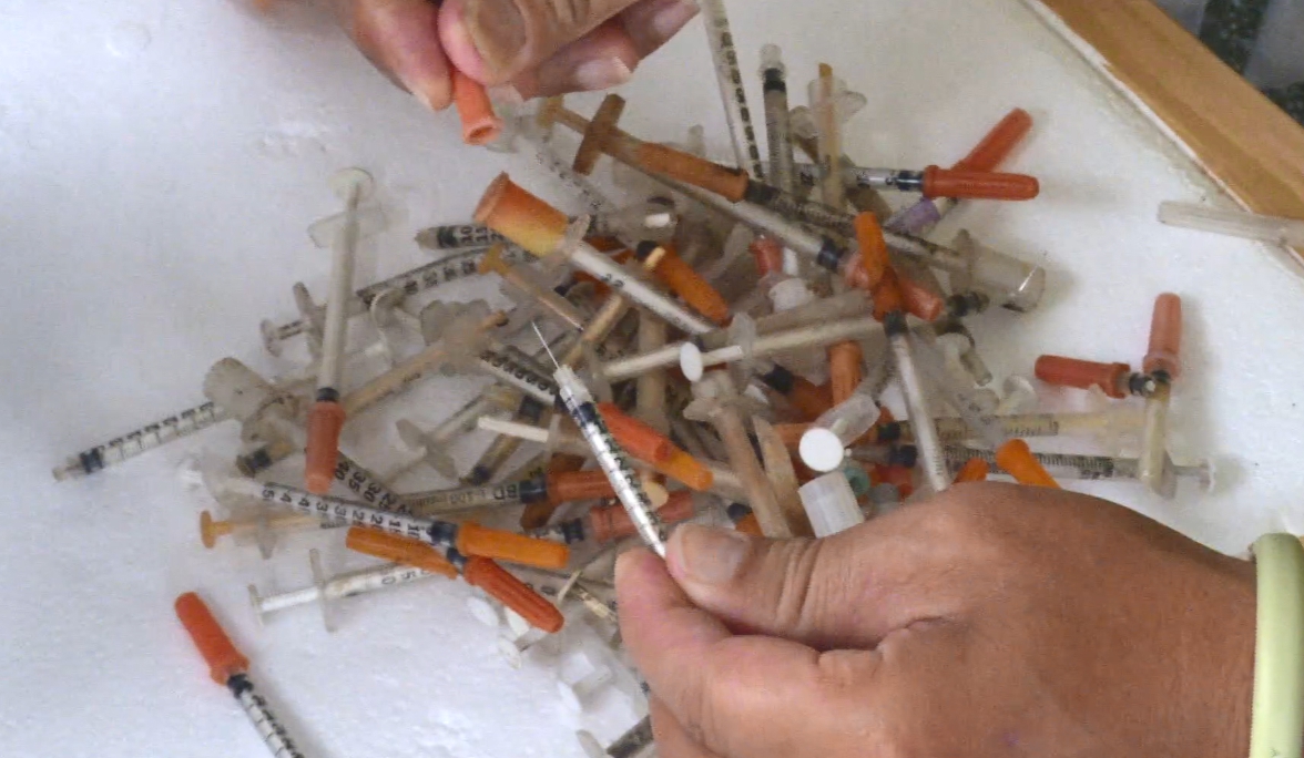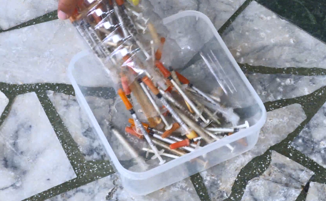 袋子裡倒出大量廢棄針頭,這些通通都是從海灘撿回來的,萬一赤腳踩在沙灘上不小心被刺到,那該怎麼辦?