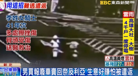 綠燈亮起只見一名騎士,從右邊轉進來另一邊的直行車道來了另一台車,左右搖晃,似乎沒看到女騎士,兩人發生擦撞雙雙倒地,41年次的李姓女騎士身上多處擦挫傷,倒地後直喊骨頭痛緊急送醫,和她發生擦撞的是一名奈及利亞籍男子,兩個人都沒有注意車前狀況,這名外籍男子在台灣從事報廢車買賣,從台灣買進車子運回奈及利亞賣出,他說因為在台灣錢比較好賺怕被遣返,竟然在筆錄上簽假名字。