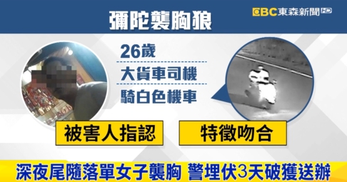 襲胸,有兩名女子被害,警方埋伏多時終於看到這名男子來回在同路段騎車,在被害人指認下,襲胸之狼終於落網。