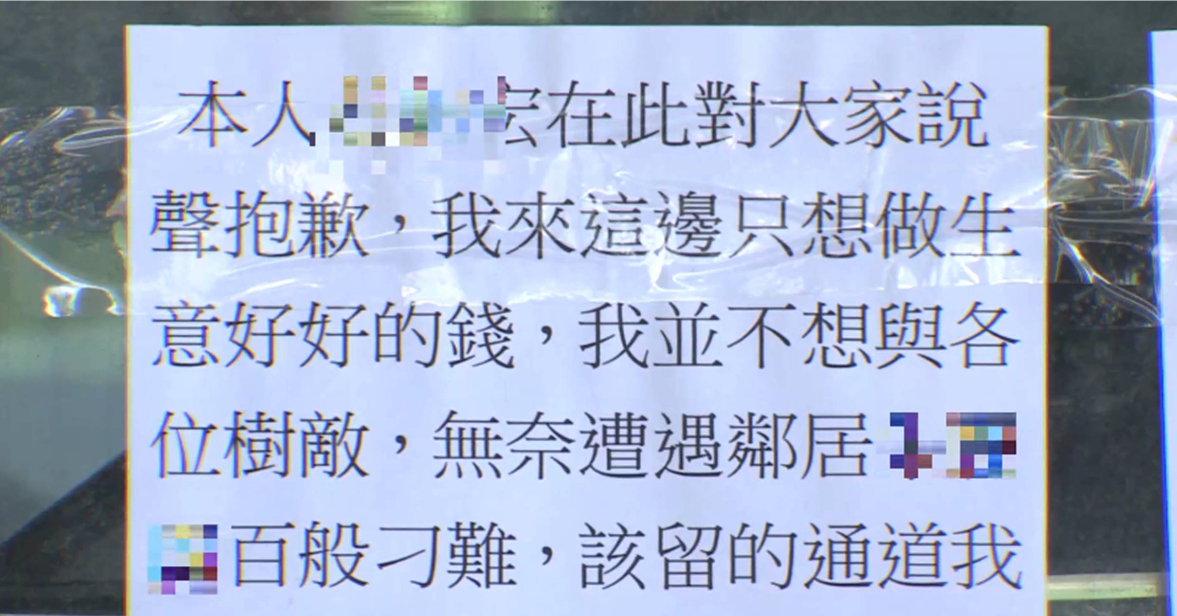 男子不甘示弱,在旁邊貼出公告,說來這裡只想做生意,不想跟各位樹敵,但鄰居百般刁難,他該留的通道也留了,而通道大小也是是國有財產局同意,當時鄰居也在場,是對方沒有地方停車,把車停在通道,質疑如果是國有地,為什麼對方可以停車?他卻 不能擺攤,不只和住戶三不五時