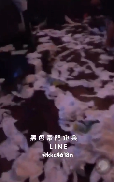 臉書《黑色豪門企業》PO出一段誇張影片,可見一名黑衣壯碩男子朝天花板吐檳榔汁,且滿地都是衛生紙、