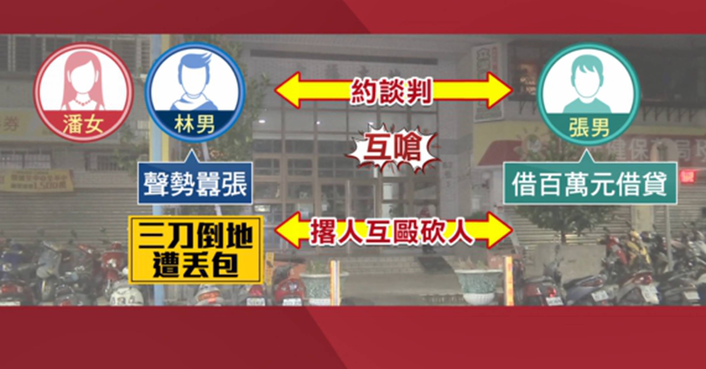 糾紛,是一名潘姓女子帶著林姓小弟,和張姓男子相約債務談判,因為張姓男子和她借貸百萬元遲遲不還,但兩方一見面就互嗆,尤其林姓小弟更是囂張,後來兩方互撂各10多人到場,口角衝突後,